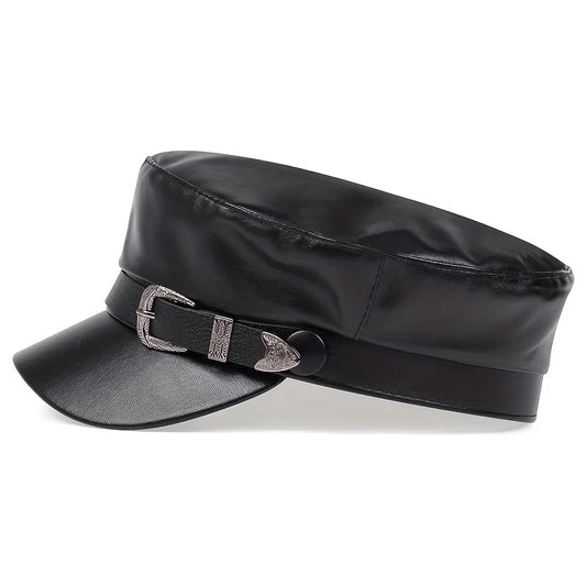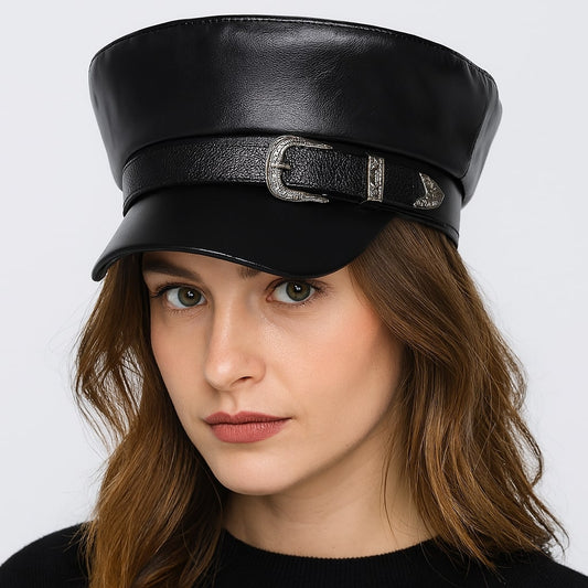 Faux Leather Sailor Cap – Flat Top With Western Buckle Detail