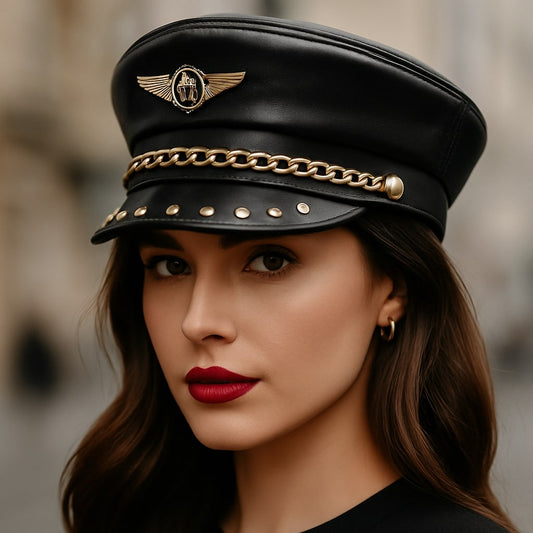 Leather Sailor Cap – With Double Chain And Structured Visor
