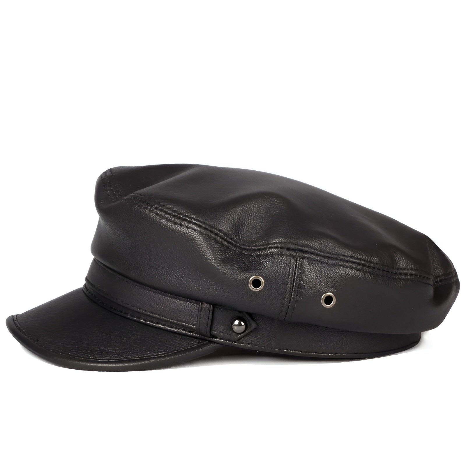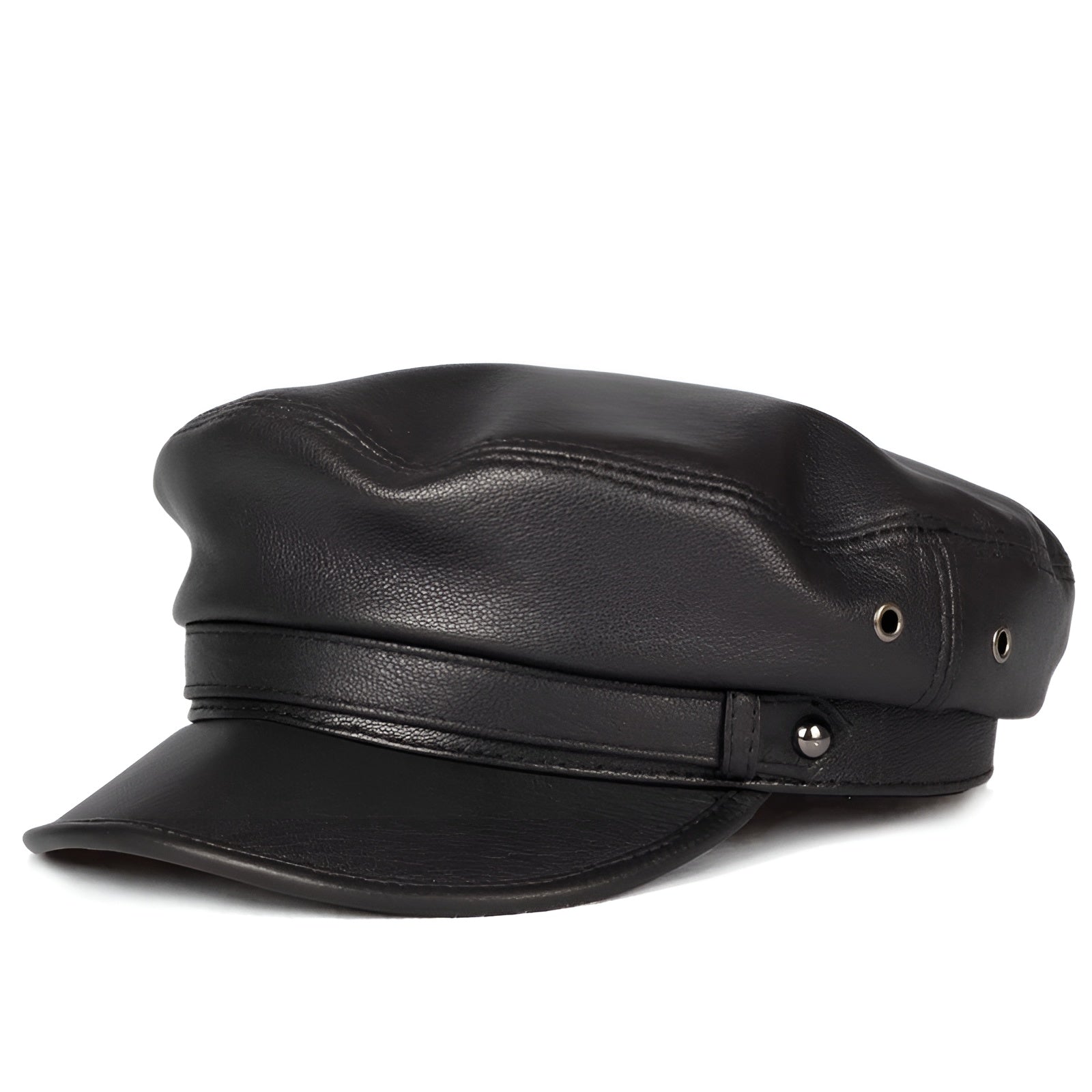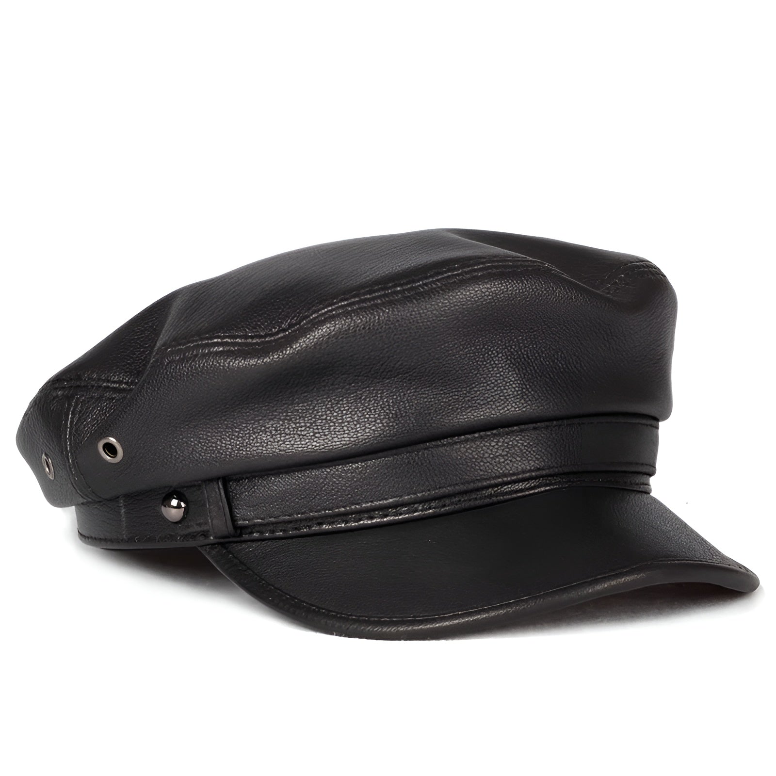 Crafted from 100% genuine sheepskin, this black leather sailor cap combines bold character and timeless style. Its short brim and flat crown add a distinct silhouette, perfect for those who appreciate minimalist fashion with a confident twist.
